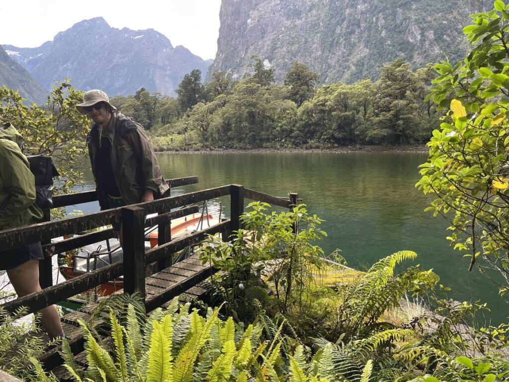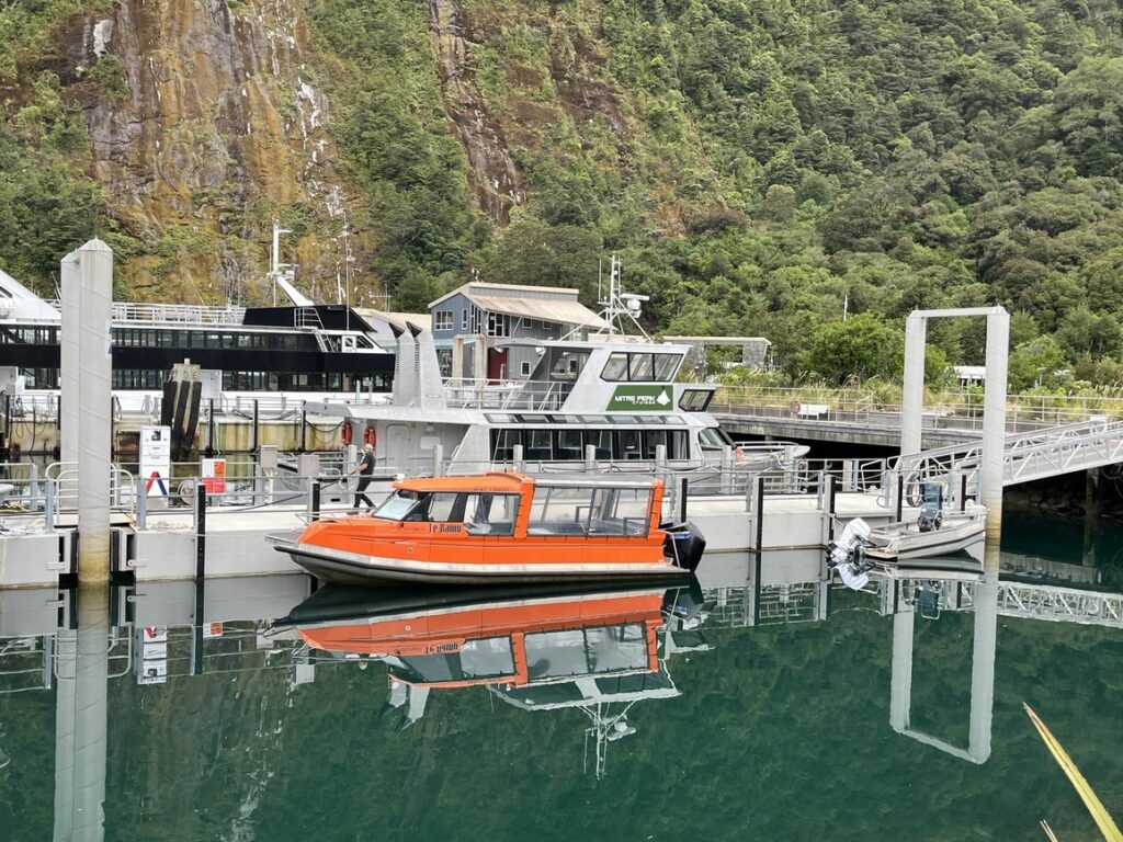 ミルフォードサウンドの船着き場、大きなクルーズ船が並ぶ中、案内されたのはかわいいオレンジ色の小型ボート。このボートはハイカーをスタートポイントまで運ぶためのボートという事でした。