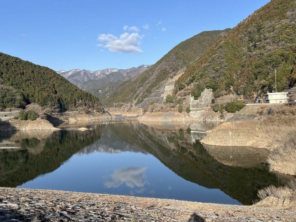 さわらびの湯駐車場から有馬ダムに向かいます。この日は穏やかな晴天で有馬ダムの湖面には雲が映っていました。しかし、ダム湖の水はとても少なくなっていました。