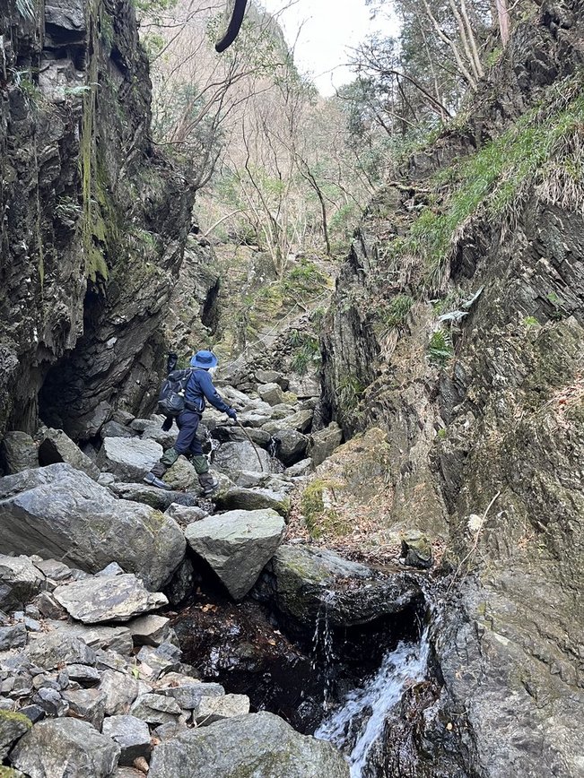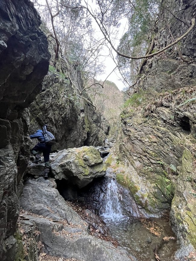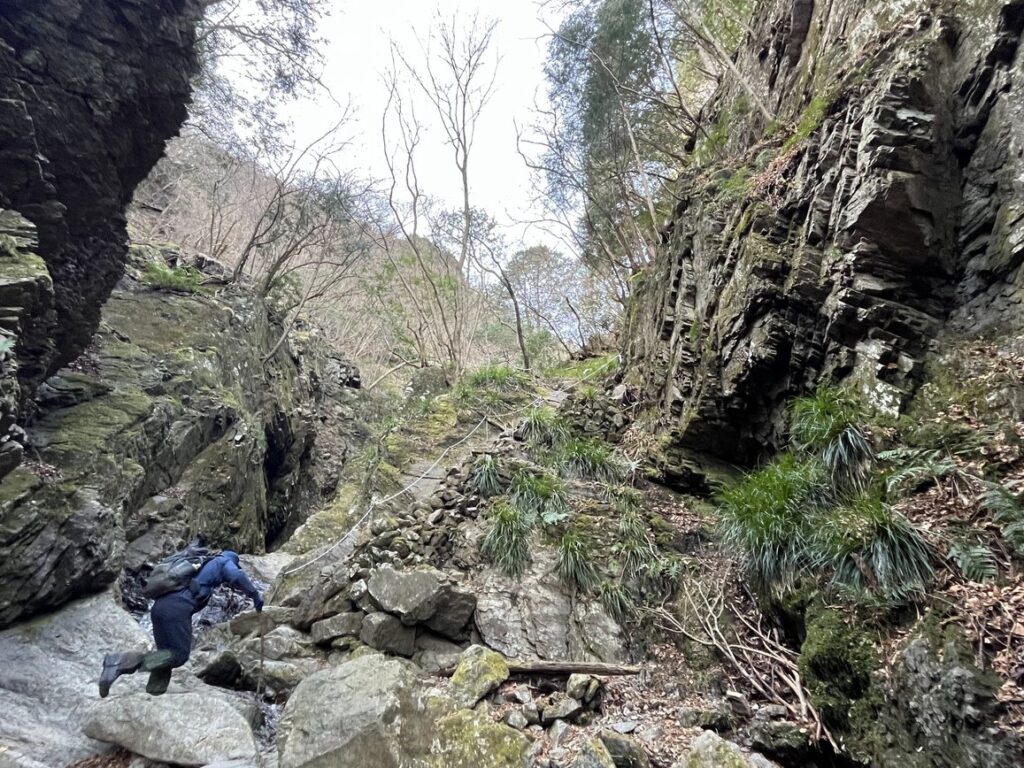 両側には切り立った岩が聳え、その間の細い通路には沢が流れ、その沢に沿って岩を登って行きます。
