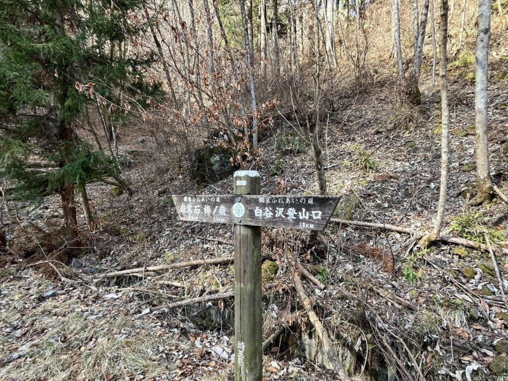 白谷沢登山口から1.8km地点で林道を渡ります。ここからは山道です。
