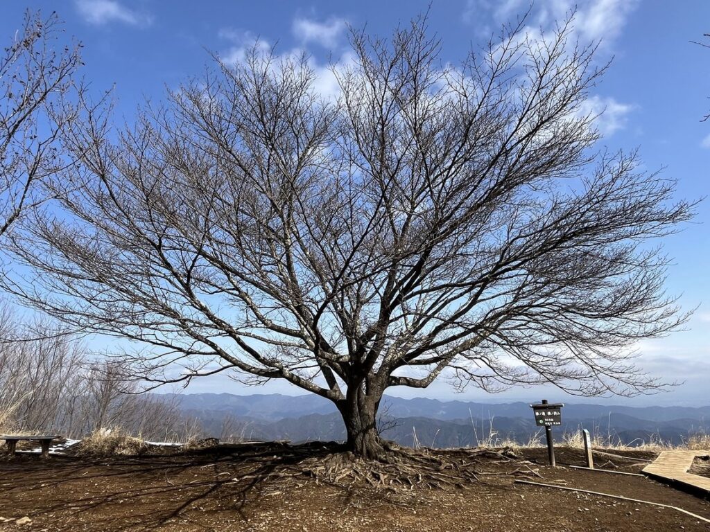 山頂には大きな桜の木があります。この木が満開になったらさぞかし美しいだろうと思いました。枝先にはまだ小さく硬い芽が付いていました。開花までには暫くかかりそうです。しかし、空に向かって大きく広がった枝は姿が美しく、青空に映えていました。