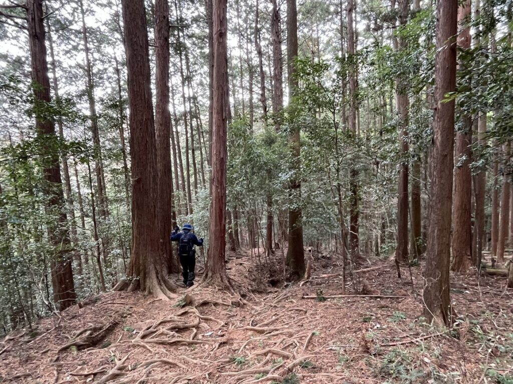 事前情報通り、急こう配プラス浮いた根っこがハードルのように張り巡らされています。終始足元に注意しながらの下山となったため、予定よりも時間がかかりました。登山口に着いた時にはホッとしました。