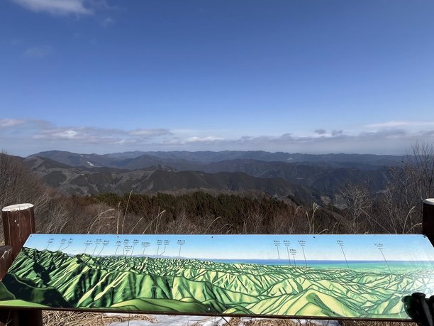 山頂は思いのほか広々としており、周囲の山々が一望できます。この日は春霞がかかっていて遠くの山はあまり見えませんでしたが、近くの武甲山、伊豆ヶ岳、日和田山などが一望できました。