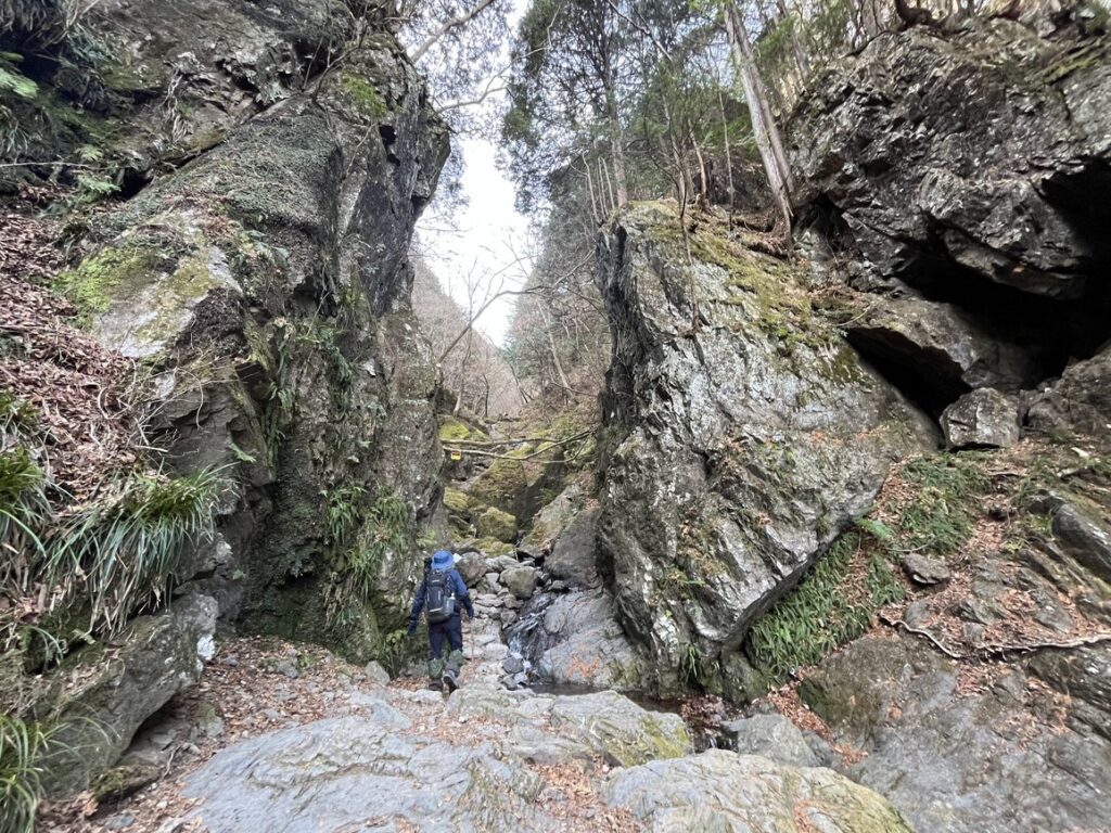 歩き始めて30分もせずに沢の横を登り始めます。小さな滝を横目に登って行くと足元の石が岩になり、その岩が大きくなってゆき、突然目の前にゴルジュの入り口が現れます。