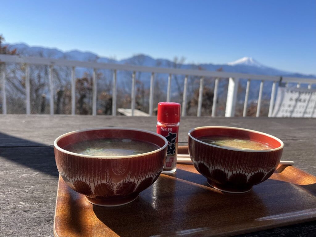 山頂に到着すると清水茶屋がちょうど開店したので、なめこ汁を頼んで持参したおにぎりを富士山を眺めながらいただきました。なめこ汁が沁みました。