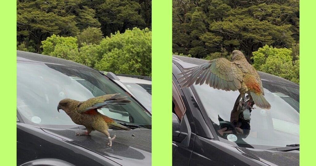 ケア(Kea、ミヤマオウム)は、ニュージーランド南島の山岳地帯に生息する、世界で唯一の雪山に暮らすオウムです。4歳児並みの知能を持つとされ、道具を使いこなすほど賢く、イタズラ好きで知られています。全身はオリーブグリーンで、羽の裏側の鮮やかなオレンジ色が特徴です。
