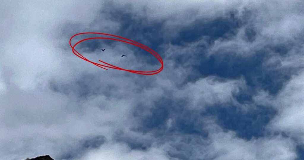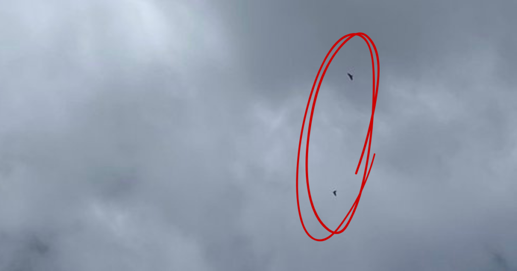 ”まさか!?”です。お母さんが指さす方向を見上げると山側の上空に2羽のケアが飛んできて旋回しています。それはあたかも、「聞きなれない声だけど、呼んでいるのは誰かな?」と呼び声の源を確認しに来たかのようでした。皆大興奮です。