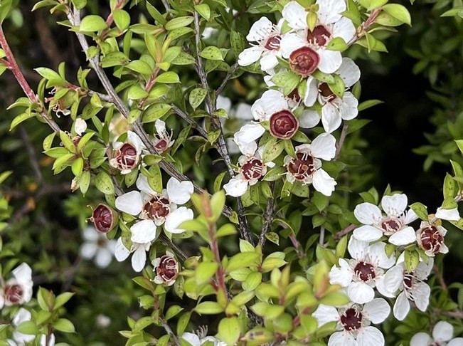 途中、はちみつで有名なマヌカの木には可憐な小さな花がたくさん咲いていました。初めて見るマヌカの花です。