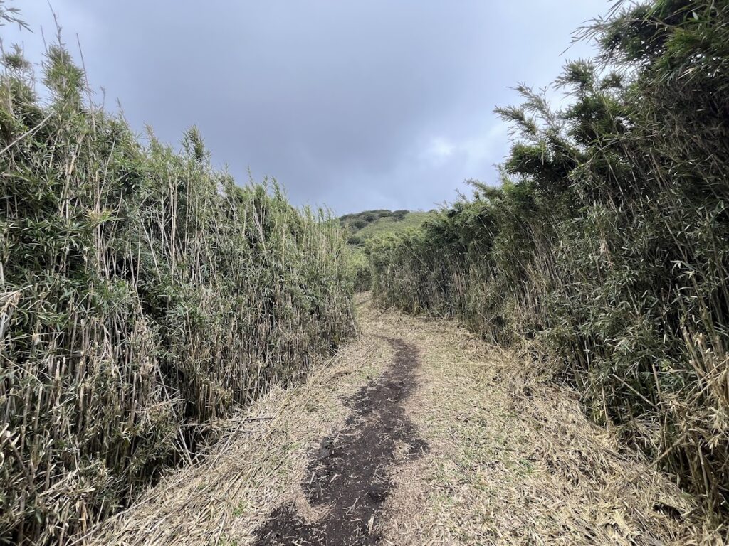 振り返れば今下りてきた金時山と笹の中に引かれた道が見えます。こちら側から見る金時山は猪鼻岳の名に相応しい形をしています。