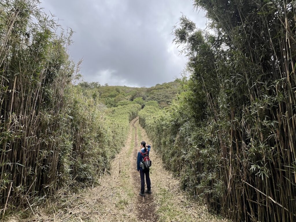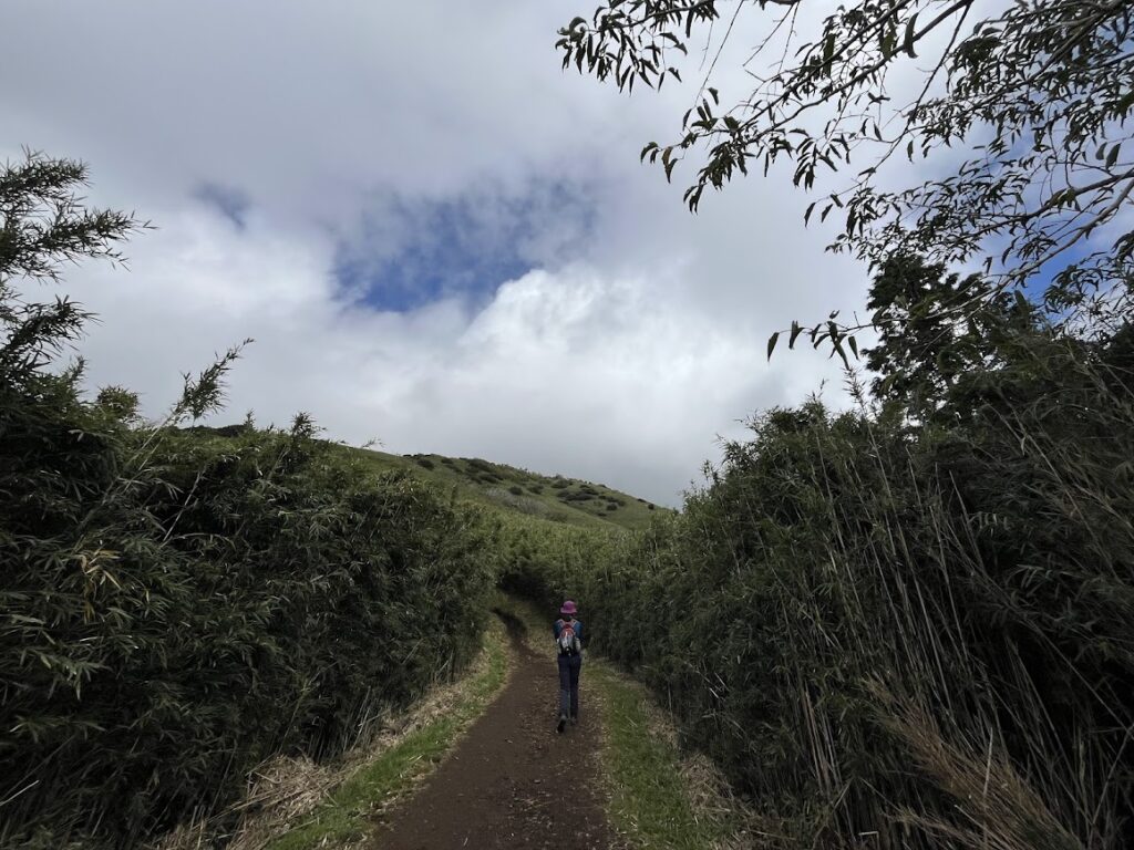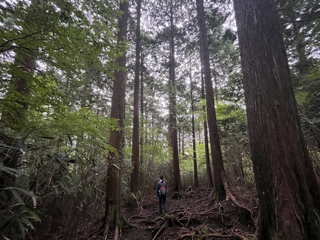 金時山登山口から山頂まではおよそ1時間です。歩いた感じでは登山道は整備されており、それほど急登を感じることはありませんでしたが、後でYAMAPの距離/標高のデータをみると2㎞あまりで500m登っています。それでも両側に高い笹が植わる道があったり、森があったりと、あまり疲れずに山頂まで辿り着きました。