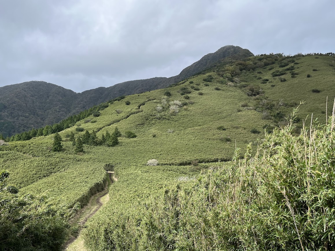 振り返れば今下りてきた金時山と笹の中に引かれた道が見えます。こちら側から見る金時山は猪鼻岳の名に相応しい形をしています。