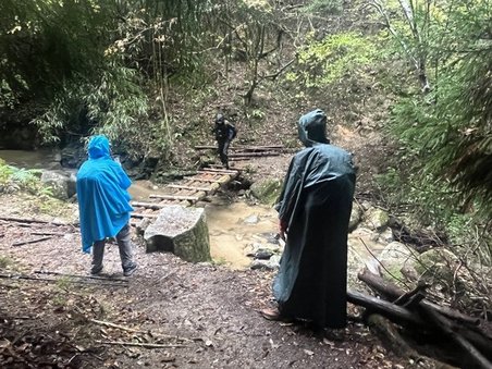 雨の中、標識を見落とすことなく進んでいたのですが、急な階段を下った後で両端が尖った”京都一周トレイル”の看板があり、下ったはずの所をまた登り返すかのように感じられました。疑問に思いながらも登り返すと先ほどの場所に戻ってしまったのです。