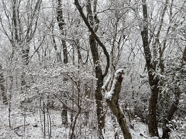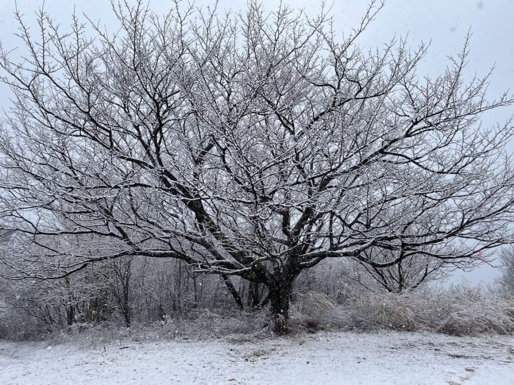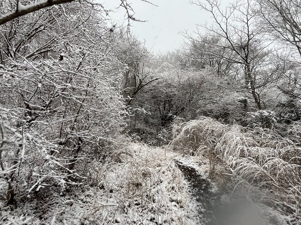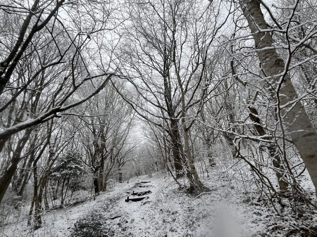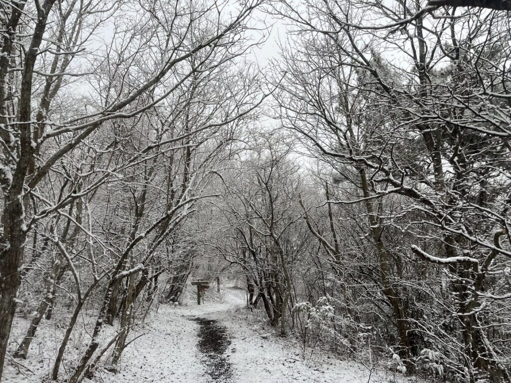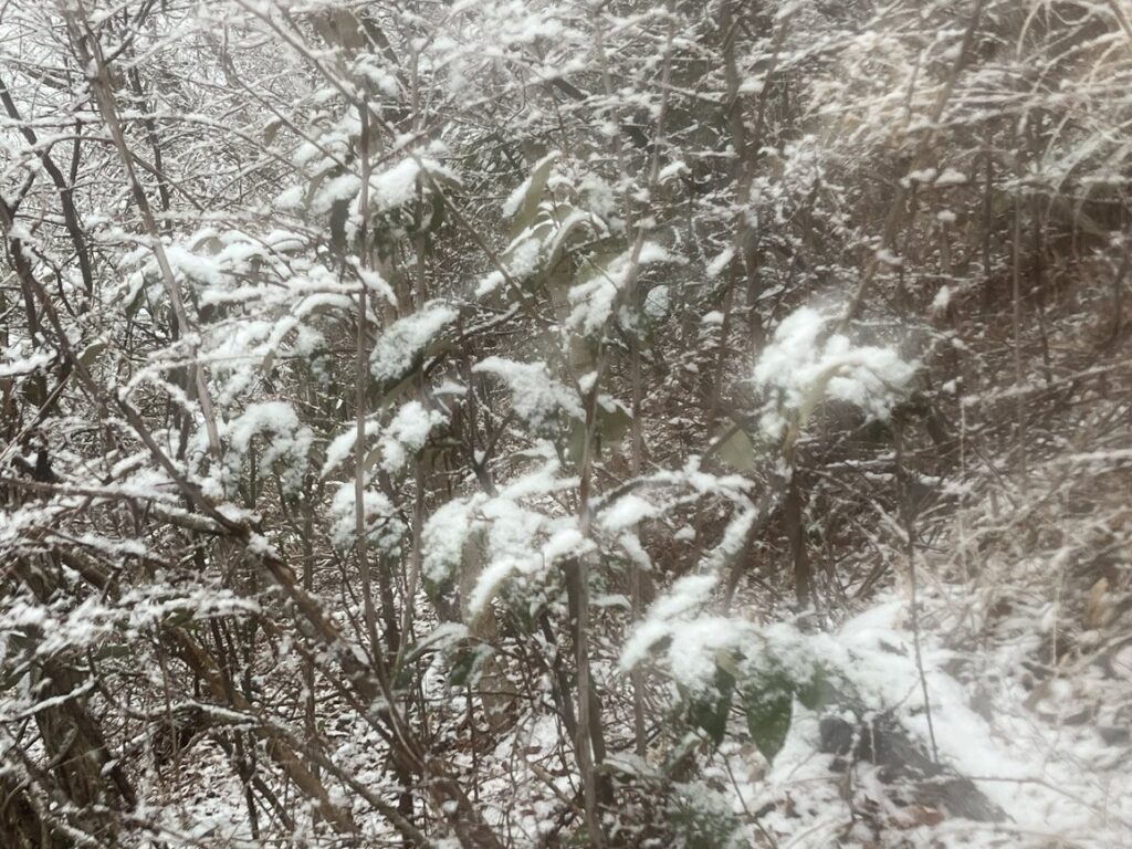 歩くほどに大粒の雪が降ってきます。みるみる周囲が白くなっていきました。木の枝にも、葉にも雪が積もっていきます。登山道もあっという間に白くなりました。