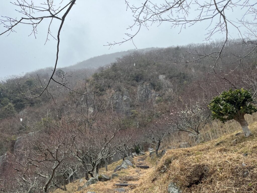 梅林にある登山口から梅の木の間を登っていきます。梅は3分咲きです。雨は止む気配がありません。道は梅林の中を通る整備された散策路です。