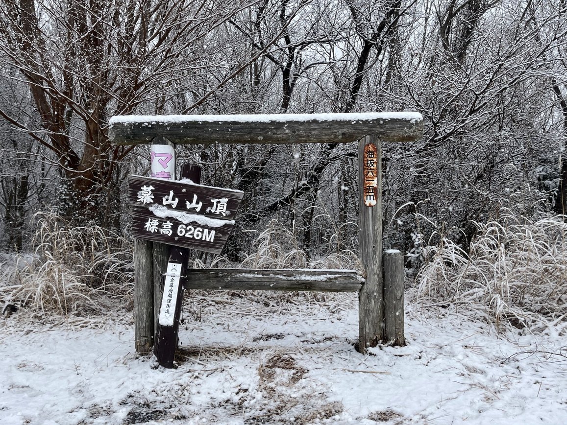 雪が降り続いています。山頂では標識にも雪がうっすら積もり、静かでとても趣がありました。