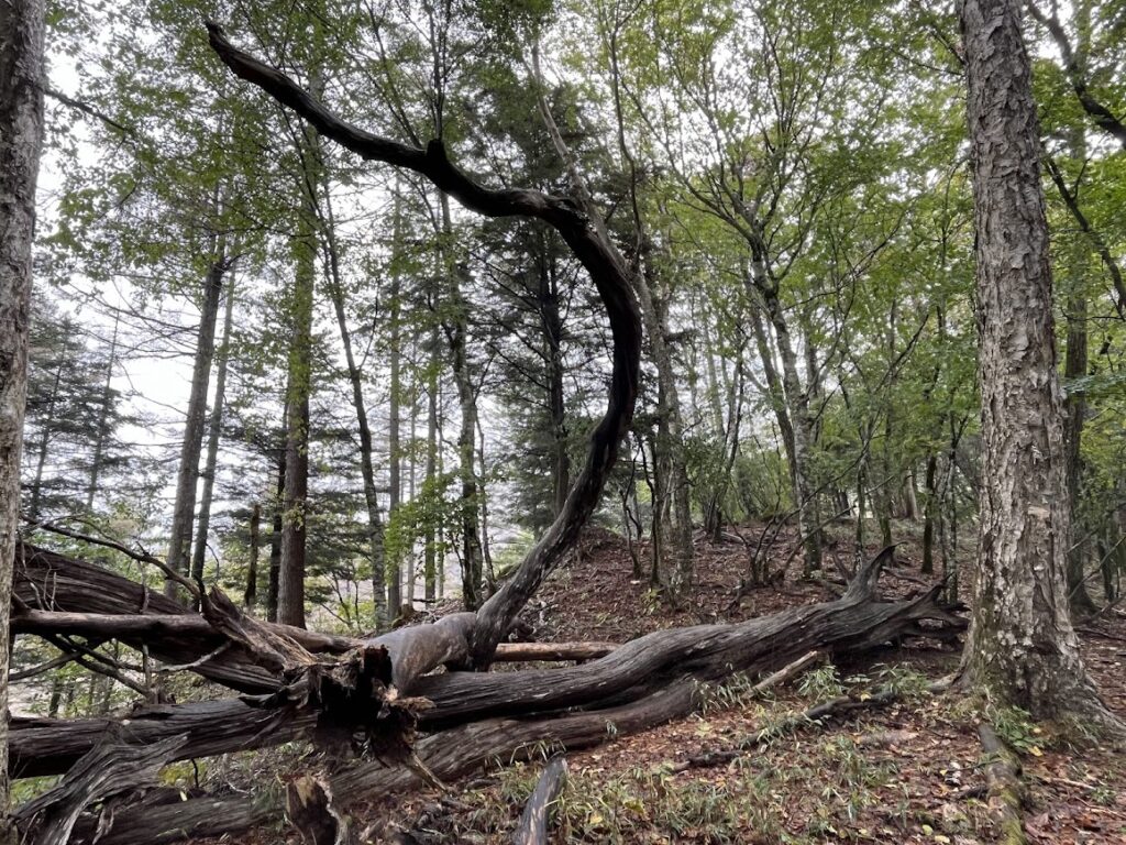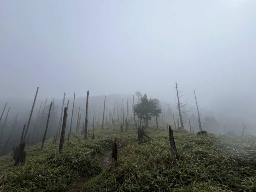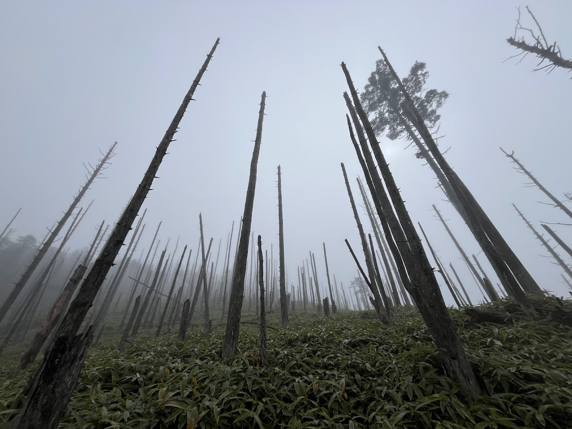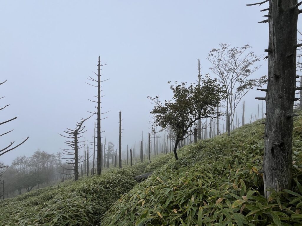 実際に行ってみると、森が開けると足元には低い笹が広がり、山の斜面一面に針が刺さったように枯れた木々が真っすぐに立っています。