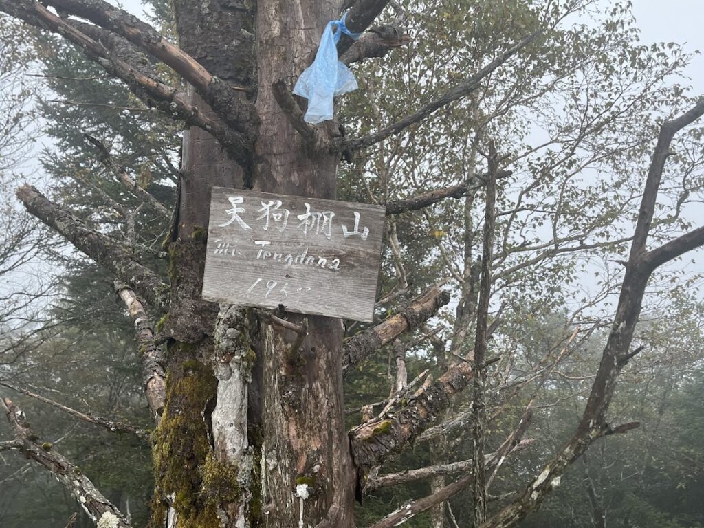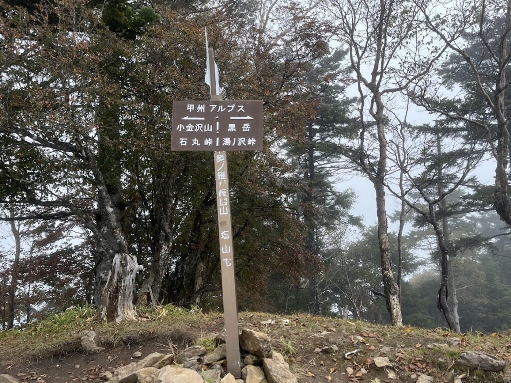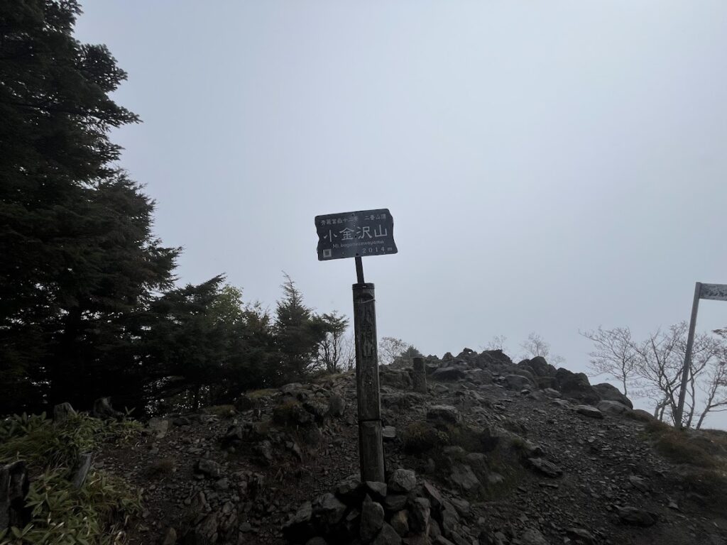小金沢山山頂でバックパックを下ろして休憩しました。霧も一層深くなり、雨もポツポツを振っています。相変わらず静かな山頂で暫くボンヤリと休憩していると天狗棚山方面から若者が一人、短パンに半袖Tシャツで颯爽と駆け上がってきました。突然の登場です。