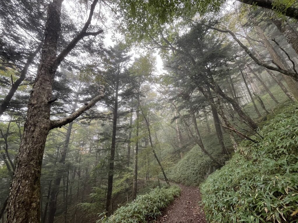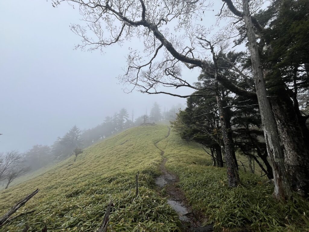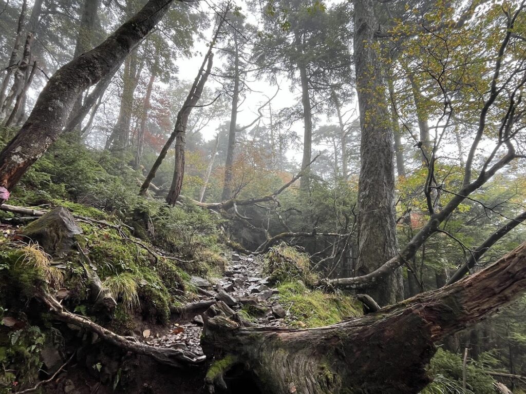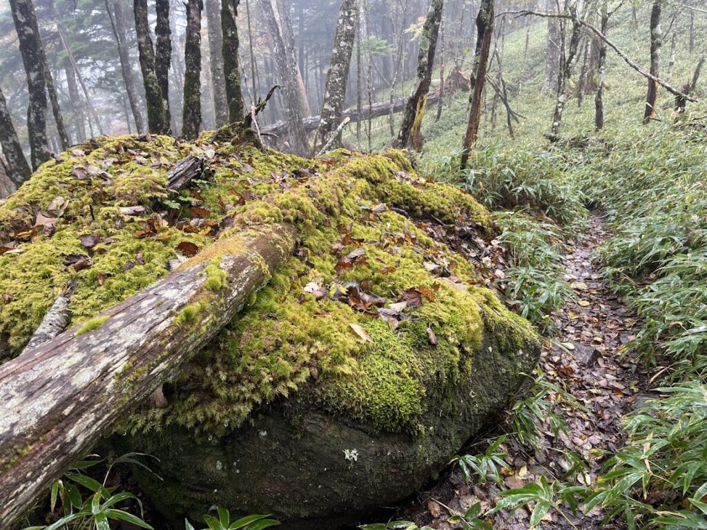 登山道を進み、縞枯れ現象の斜面に出るころ、雨が少し強くなってきました。ここでレインパンツを穿くか迷いました。暑くなり過ぎないか心配でしたが、開けた場所があったので、一旦荷物を下ろしてしっかりと装備を整えることにしました。